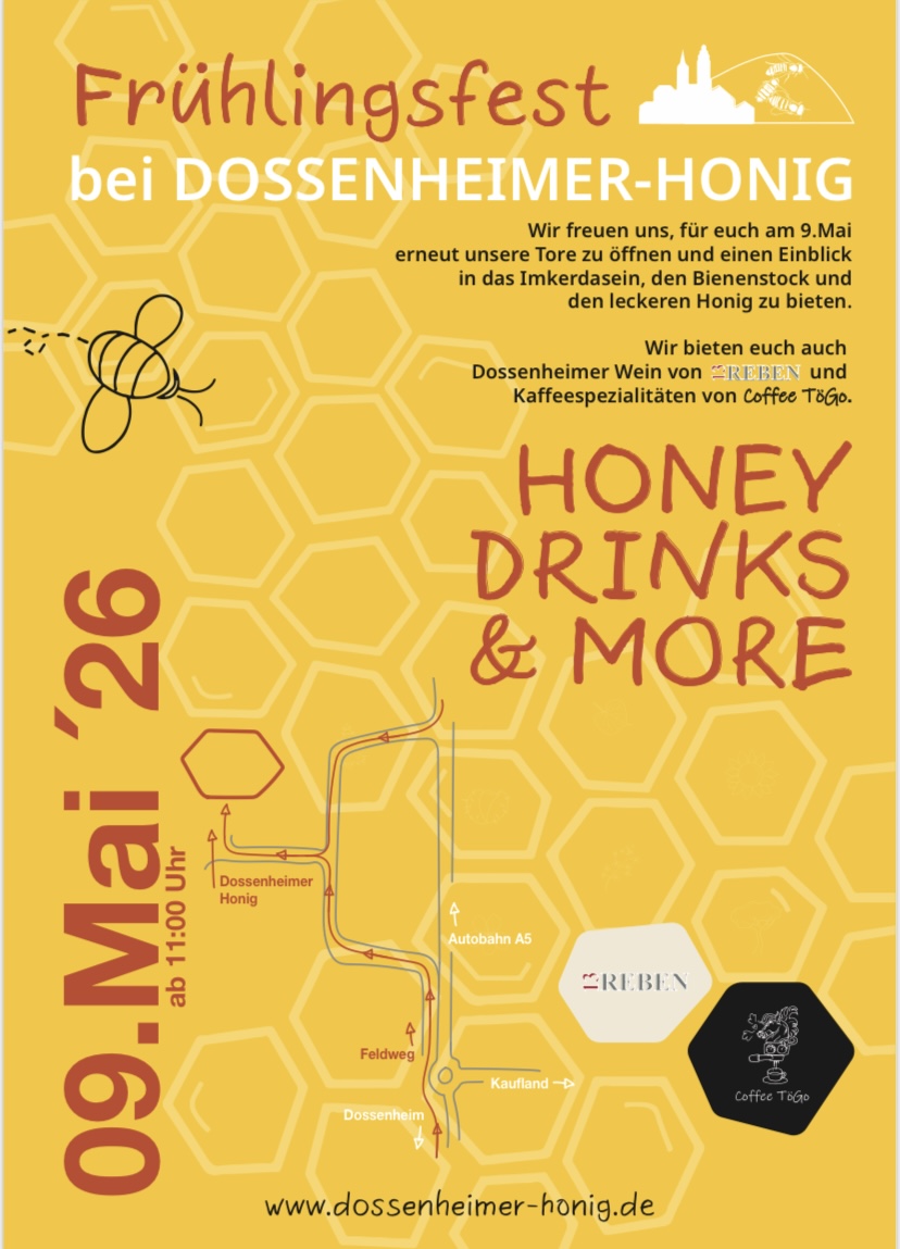 Wir veranstalten am 9. Mai wieder ein Frühlingsfest auf unserem Gartengrundstück. Neben unseren Bienen, der Möglichkeit einen Bienenstock mal genauer zu betrachten und alles über Honig zu erfahren, gibt es leckere Verpflegung von uns, Dossenheimer Wein von 13Reben und Kaffeespezialitäten von Coffee TöGo.